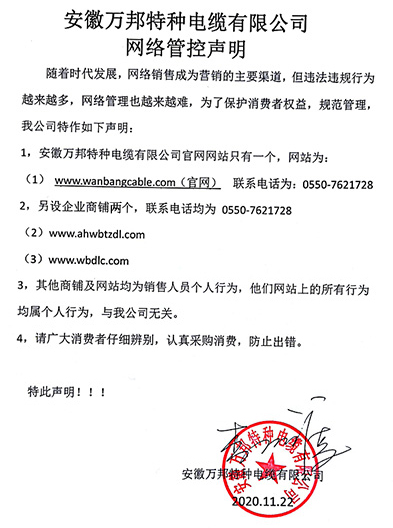 鄭重聲明:安徽萬邦特種電纜有限公司官方網站為:www_wanbangcable_com.609nb.com,除此之外無任何子網站或合作網站,其余均為假冒偽劣。電話:0550-7621728 13485756353 地 址:安徽省天長市滁州高新技術產業開發區經四路29號